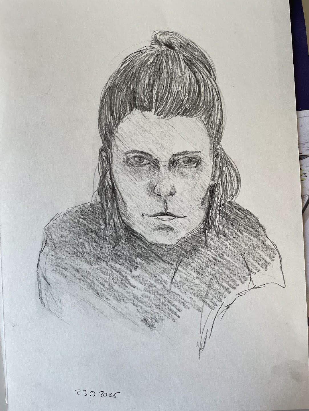 Tässähän tuli jo hiki :D! Stressaava jos mikä. Huomasin taas, että tyylittely on minulle vaikeaa. En löydä sitä yhtä asiaa joka tekisi muotokuvasta tunnistettavan. Joku yksi asia, jonka yhdellä, kahdella viivalla kertoisi koko tarinan. Eli tätä minun tulisi harjoitella.