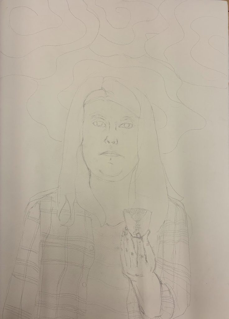 Omakuvan hahmottelu tuli tehdä peiliä käyttäen. Meikkipeili jota käytin oli jokusen pieni, mutta sillä pärjättiin.