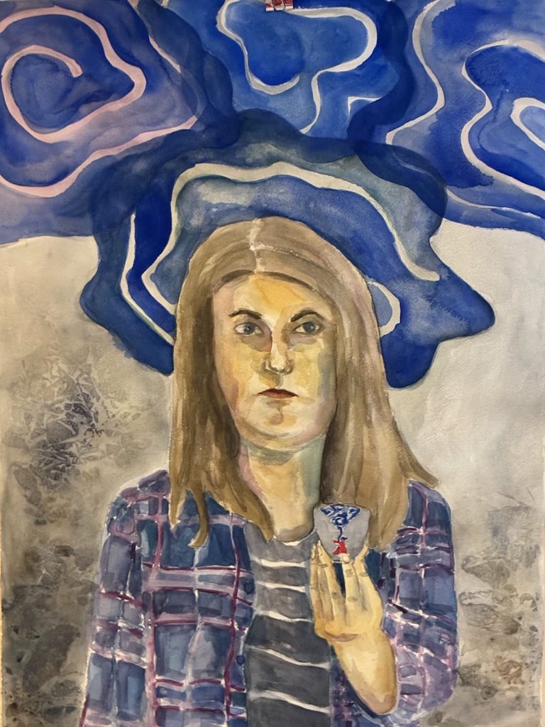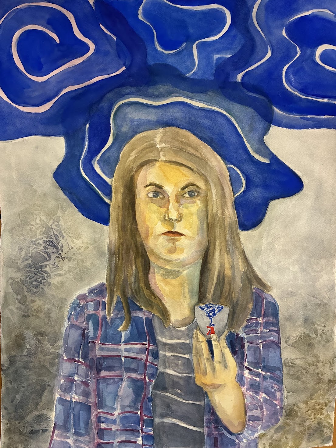 Tehtävänä oli piirtää omakuva vesivärein, lisäksi teoksessa tuli olla joku oma tärkeä esine. Kävimme teoria osuudessa läpi sommittelun periaatteita.