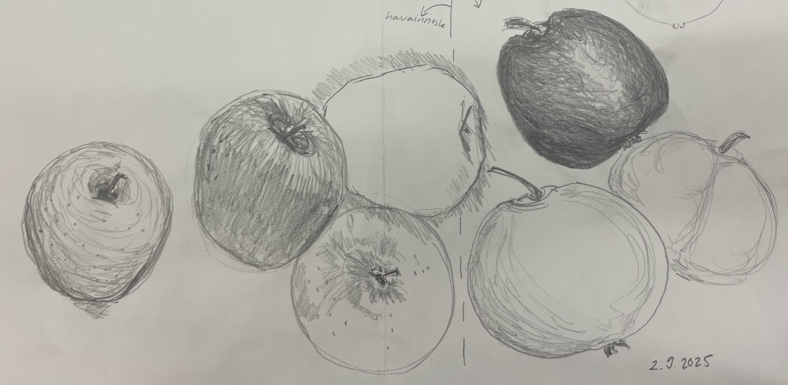 Lisäksi viimeisempänä työnä meidän tuli piirtää omena muistista, alla olevassa kuvassa oikealla olevat omenat ovat muistista ja vasemalla olevat ovat havannoista. En siis muistanut lainkaan miltä omena näyttää. Tein alaosasta leveän, niin kuin kurpitsan. Tämä kertoo miten paljon meidän muisti valehtelee ja pelkistää, siihen ei siis voi luottaa. Toivon kuitenkin että harjaantuisin jatkossa myös muistista piirtämiseen.