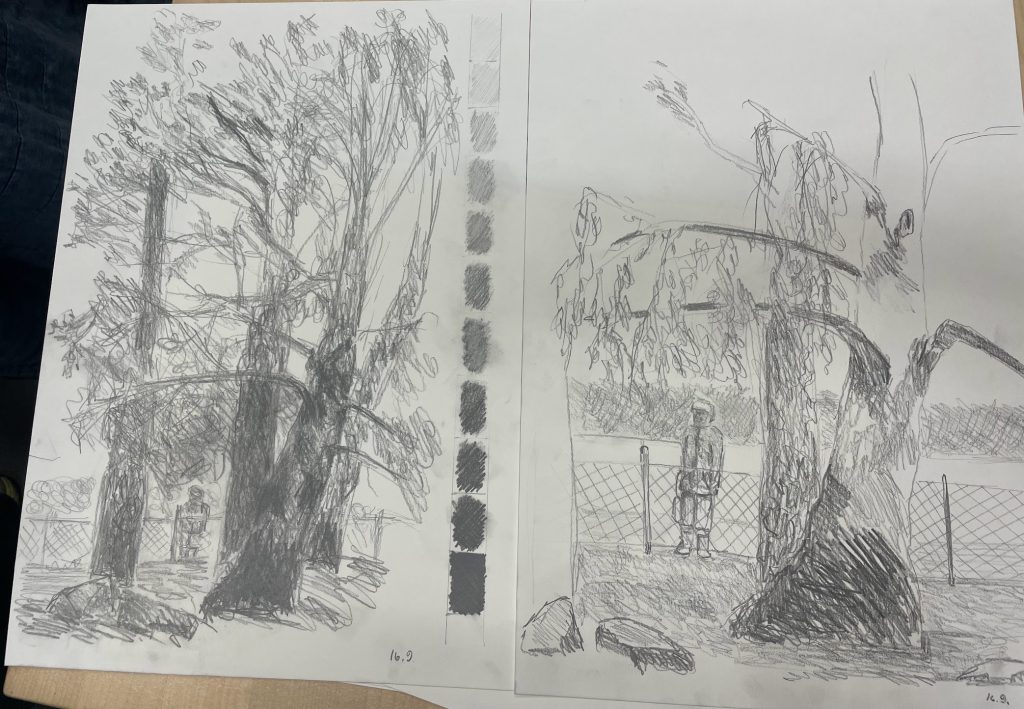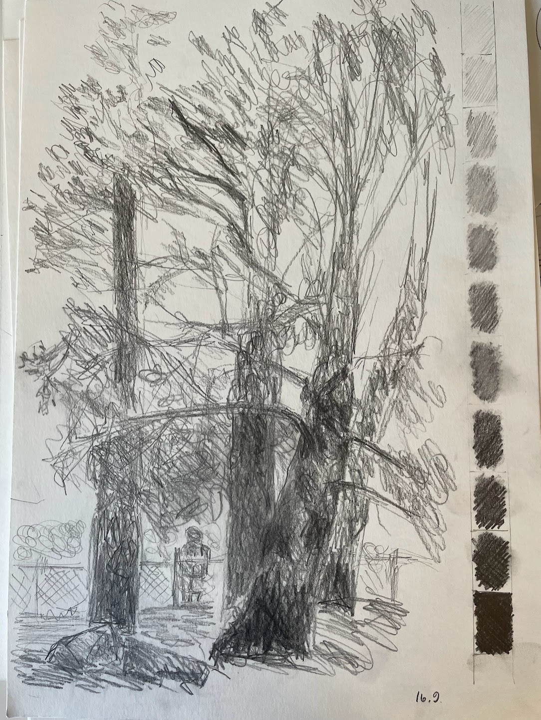 Tunnin aluksi teimme valööriasteikon paperin sivun. Vaaleasta tummaan. Mitä pehmeäpi lyijy, sitä tummempaa jälkeä sai aikaiseksi. Tummassa päässä en saanut kunnolla eroja enää tehtyä, "ensimmäiset" tummat menivät jo liian tummiksi. Valööriasteikon jälkeen piirsimme ulkona itse valittua kohdetta, tarkoitus oli valita joku kohde jossa olis orgaanisia muotoja, ja piirtää niin, endellisellä tunnilla harjoiteltujen miitaamisten avulla ja havainnoiden valoja ja varjoja. Kohde tuli piirtää 30 min. Tämän jälkeen palasimme takaisin luokkaan ja kohde tuli piirtää uudelleen. Tyylitellen. Tyyylittely ei ollut minulle helppoa, piirrän mielummin suoraan havainnosta yrittäen tehdä siitä näköisen ja "tyylittelemäni" toinen kuva oli vain toisto ensimmäisestä.