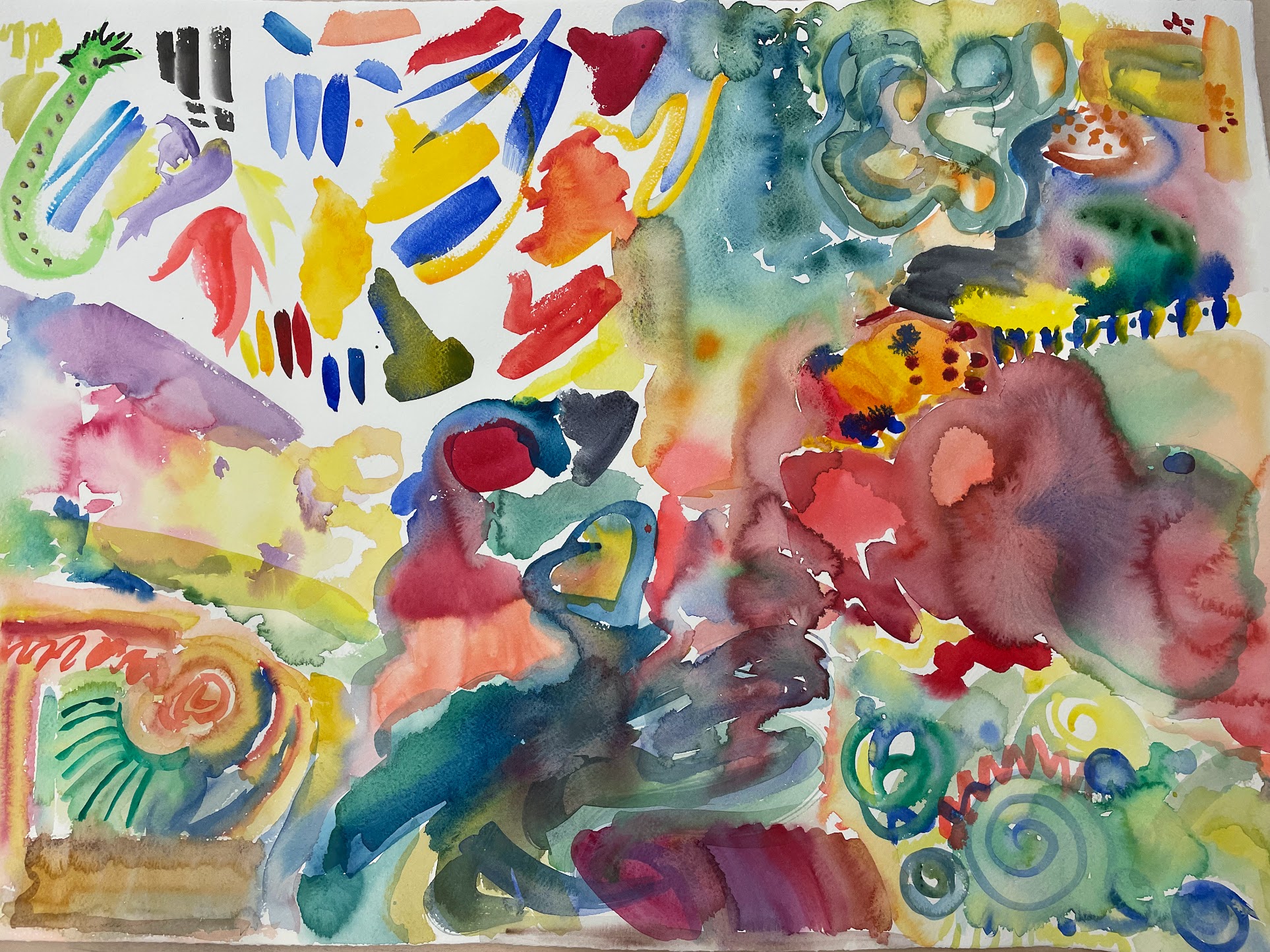 Alkulämmitystyönä teimme ryhmänä yhden valtavan kokoisen paperin. Ei ollu sääntöjä, muita kuin että piti kunnioittaa toisen piirtämiä kuvia. Tässä oli tarkoitus tutustua vesiväreihin materiaaleina, ilman mitään paineita, että tekisin sen oikein tai väärin. Saimme käyttöömme myös kunnolisen vesiväripaperin, jotta saisimme tuntumaan oikeaan materiaaliin.